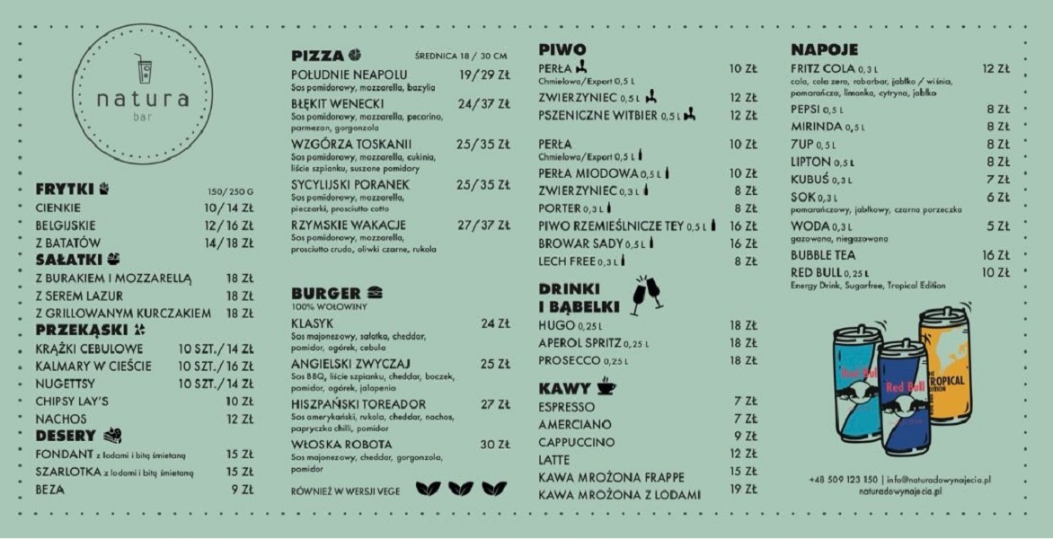W barze serwujemy burgery, pizzę, frytki, świeże sałatki. Całość dopełniają lody naturalne, wybór Fritz Coli, napojów gazowanych oraz bogatej oferty piw rzemieślniczych z lokalnego Browaru Sady.
